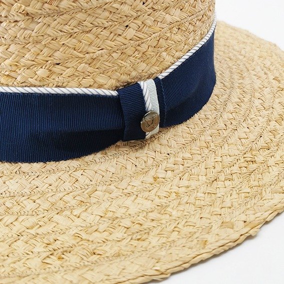 Côté garniture, un ruban bleu marine, réhaussé d’un liseré rayé ciel, apporte une touche graphique subtile et chic. La boucle latérale, inspirée des uniformes de la Belle Époque, vient finaliser l’ensemble avec une sophistication assumée.