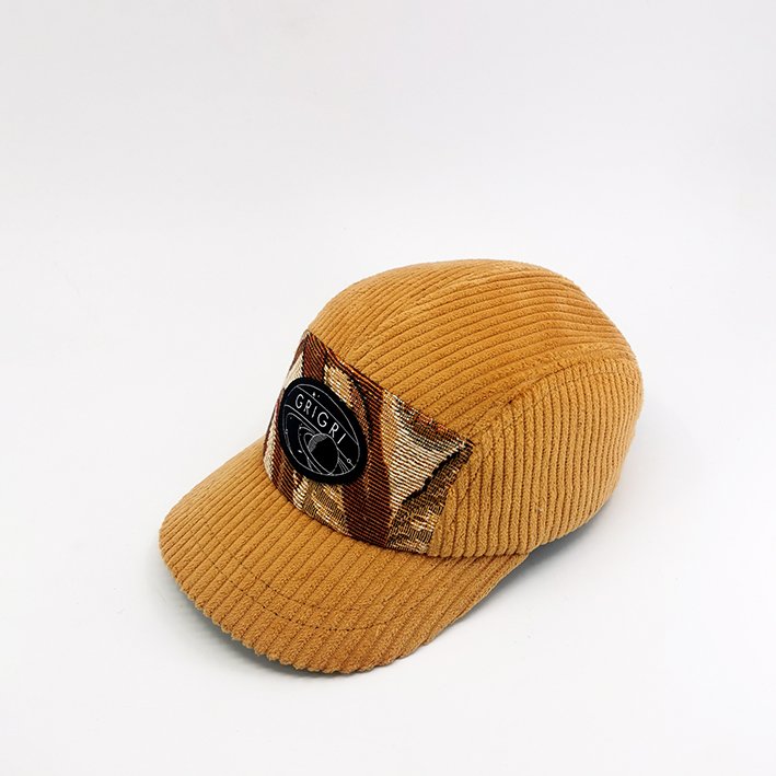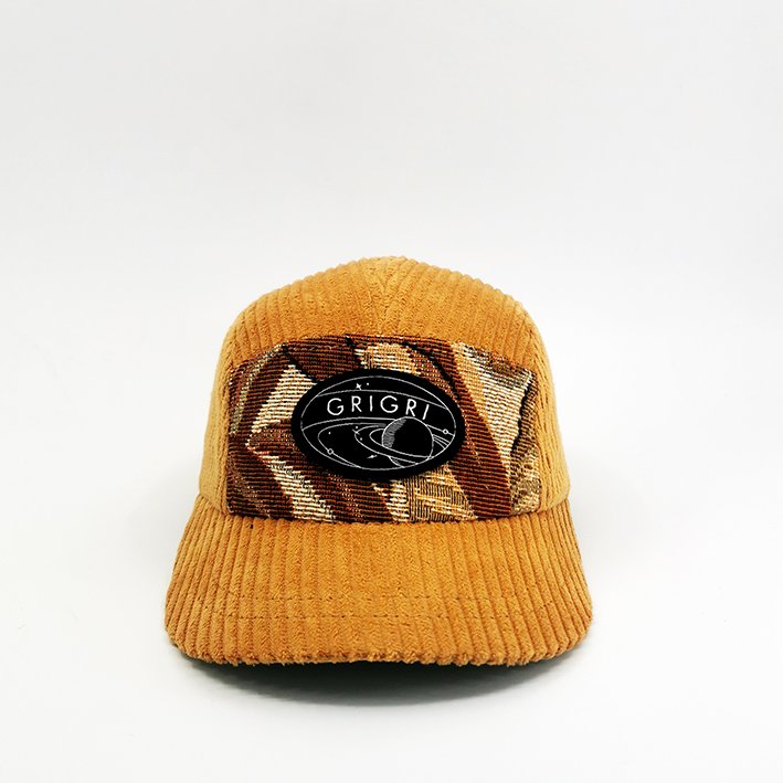 Casquette 5 panel cap et Visière dessus en velours grosses côtes jaune.