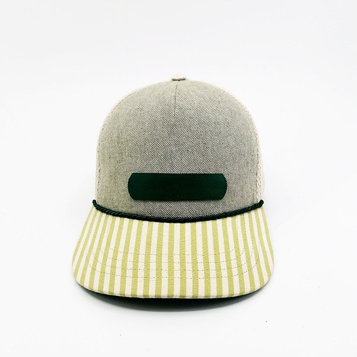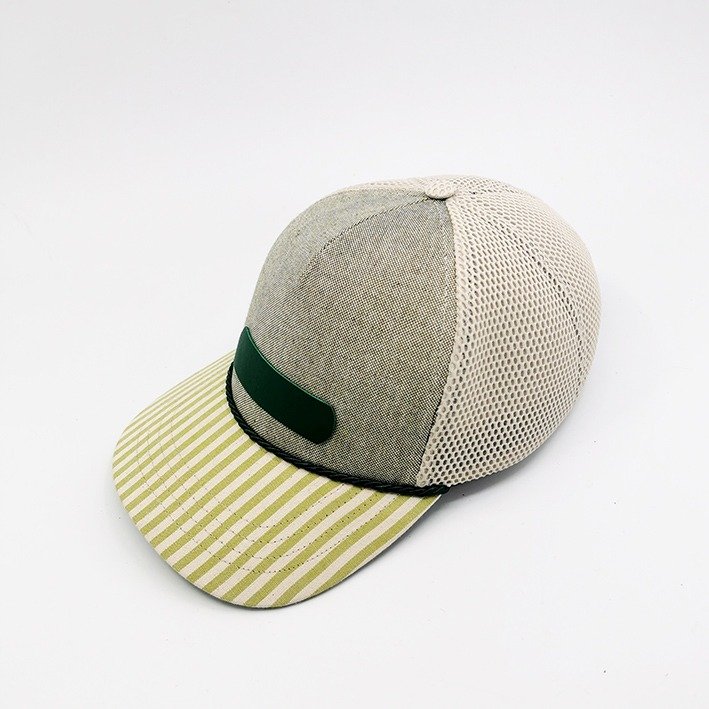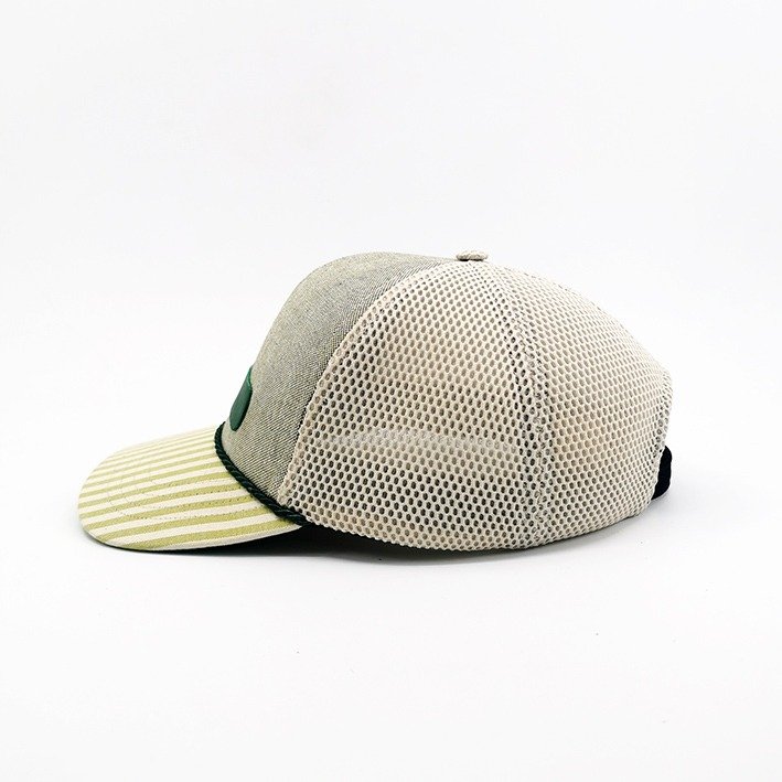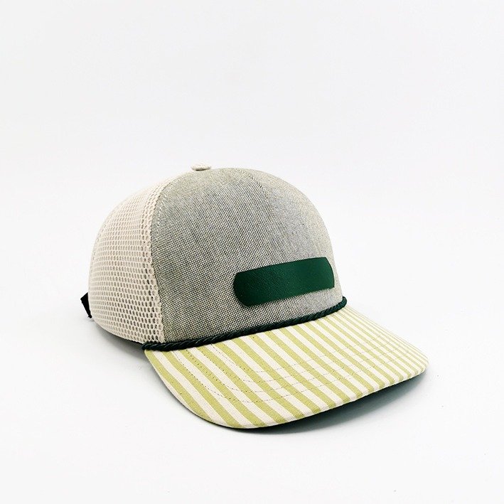Ce qui frappe d’emblée ? Sa visière rayée pop, en coton au motif vert anis et ivoire, délicatement surpiquée. Un cordon fin vient souligner la jointure avec la calotte, clin d’œil discret aux casquettes des années 70. Le patch en cuir vert profond donne de l’assise à l’avant, pendant que l’arrière en mesh beige offre fraîcheur et respirabilité même en plein soleil.