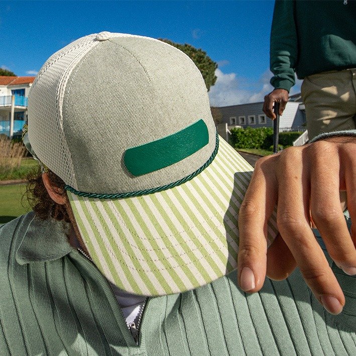 Un samedi d’été sur le golf de Bourgenay. Tu rejoins ton ami d’enfance pour une grande partie attendue depuis des semaines. Il porte la casquette DAVY rayée verte, toi la Cassius casquette trucker verte. Vos casquettes dialoguent comme vos swings : précis, décontractés, résolument personnels.