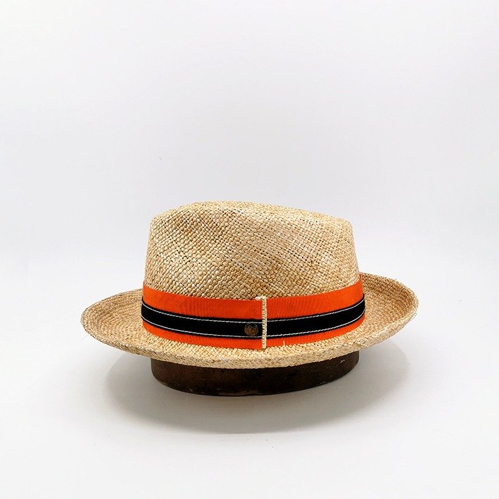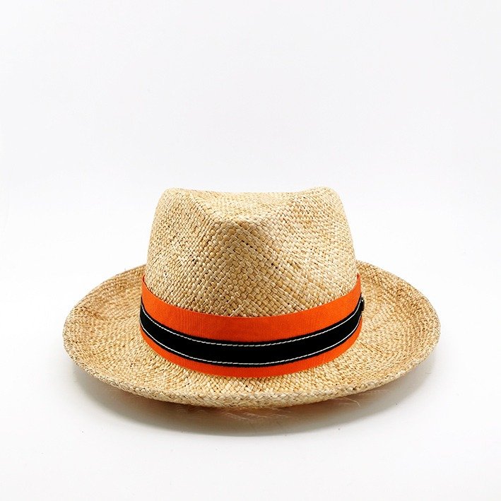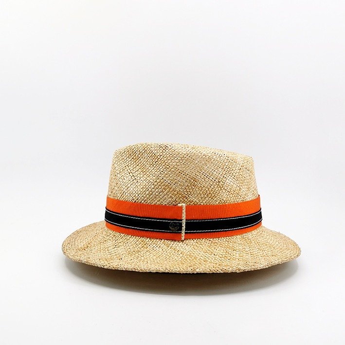 Son design simple et graphique est rehaussé d’un ruban orange vif façon gros grain, souligné d’un liseré noir et blanc. Une signature visuelle subtile, rétro sans nostalgie, parfaite pour les journées lumineuses, la plage d’été, ou un départ improvisé. Un beau chapeau, indémodable, qui trouve naturellement sa place dans la garde-robe estivale.