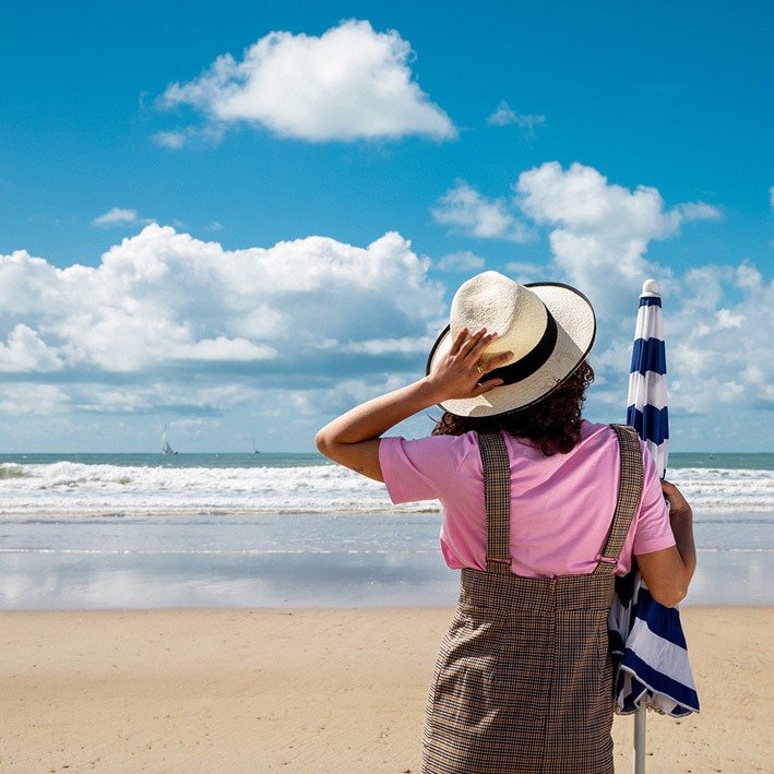Une robe en lin ivoire, des sandales en cuir tressé, le ADEL panama vissé bas sur le front. Pour les soirées, ajoute un rouge à lèvres corail et un kimono fluide.