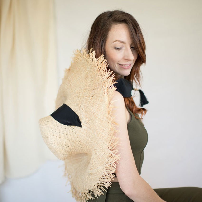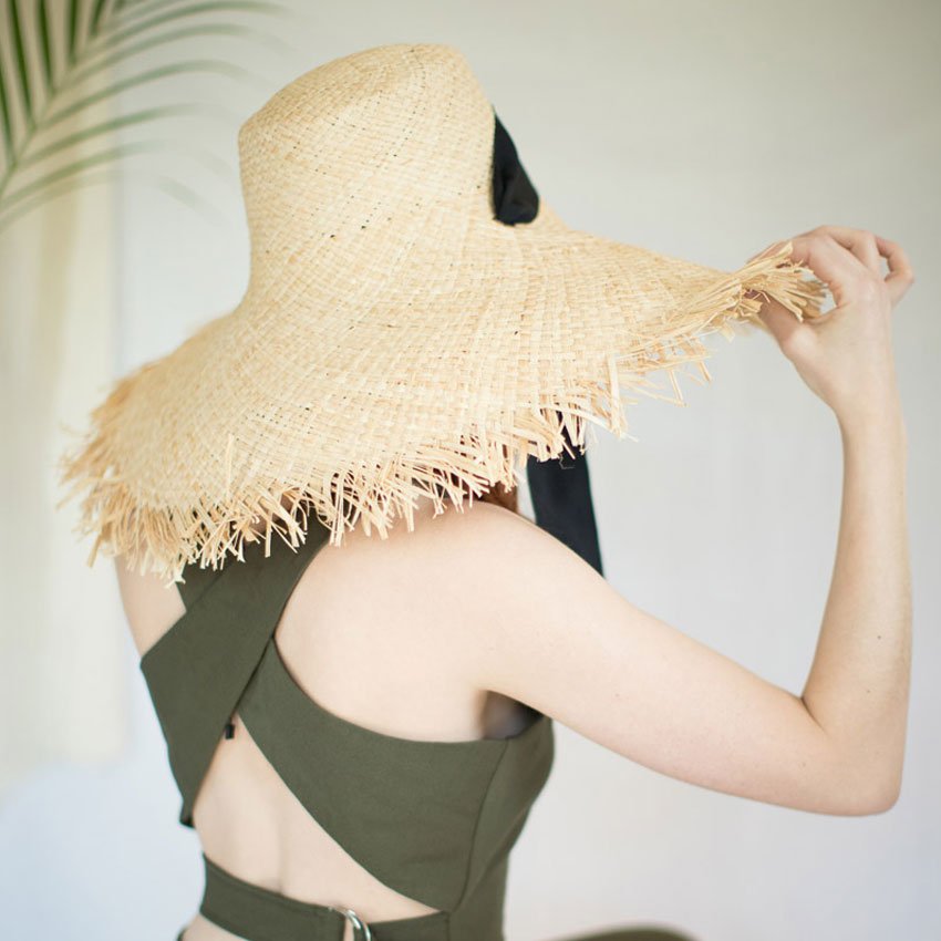 Son esthétique audacieuse avec son bord brut très large en raphia effiloché et sa calotte haute, est l'incarnation de l'esprit voyageur.