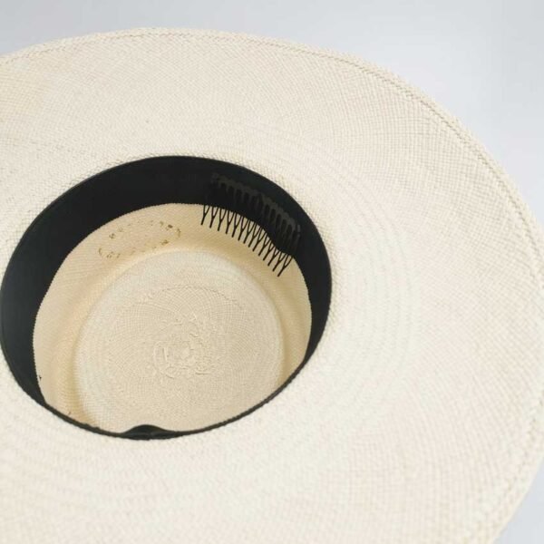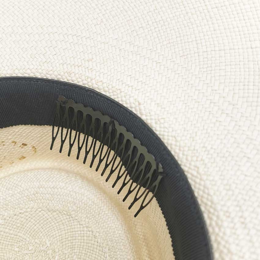Si vous souhaitez un maintient plus important de votre chapeau sur votre tête, nous pouvons coudre un peigne à l'intérieur de votre chapeau, sur l'entrée de tête. Il sera cousu sur le côté droit ou gauche, selon votre choix. Vous pourrez porter votre chapeau selon votre choix, avec ou sans peigne.