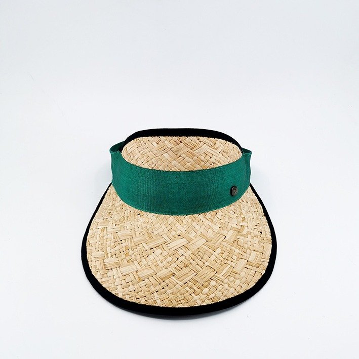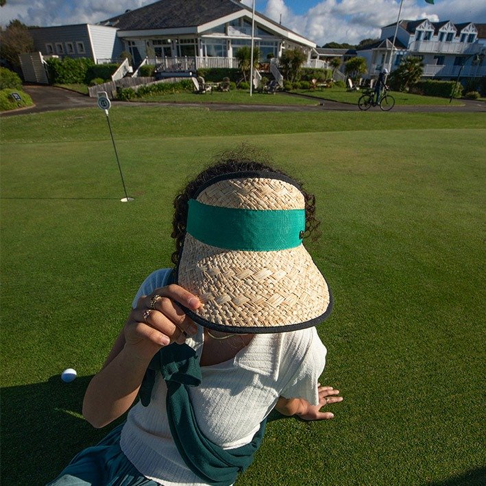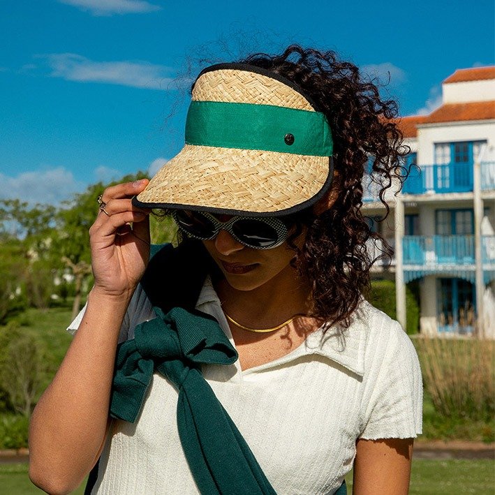 Sa matière est en paille raphia fantaisie, tressée avec justesse pour assurer légèreté, souplesse et résistance. La texture naturelle se marie à un gros grain vert éclatant, profond comme un green fraichement rasé. Son biais noir finit le tout avec élégance, structurant visuellement la visière pour mieux en souligner la forme. À l’arrière, une patte velcro permet un ajustement fin à toutes les têtes, avec ou sans volume capillaire. C’est la visière golf femme idéale pour cheveux bouclés, frisés ou crépus : elle libère la nuque, ne casse pas les boucles et laisse respirer le cuir chevelu. Une révolution subtile mais décisive dans le monde des couvre-chefs d’été.